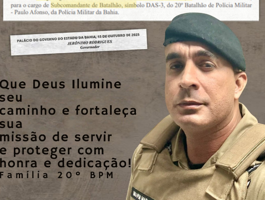 Assim sendo, a Tenente-Coronel PM Emília Neta, Comandante do 20º BPM, juntamente com os oficiais e praças da Unidade, saúdam o novo Subcomandante, desejando-lhe êxito na missão, sabedoria e luz na condução de suas novas atribuições.