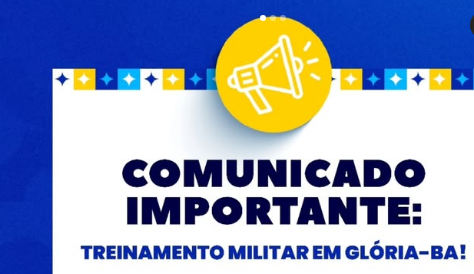 A Prefeitura de Glória informa que o Exército Brasileiro, por meio da 1ª Companhia de Infantaria, realizará um treinamento militar nos dias 12 e 13 de novembro, nas proximidades da Usina Hidrelétrica Luiz Gonzaga (Itaparica).